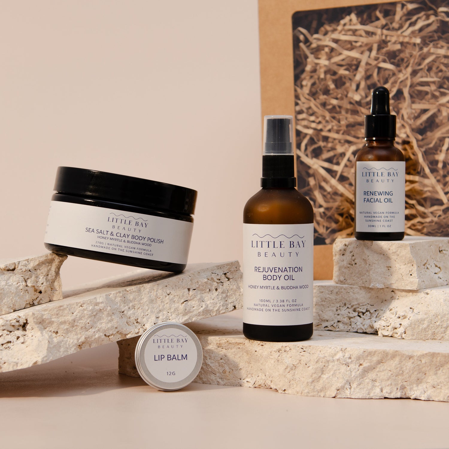 A luxurious gift set featuring five of our most-loved products—valued at $45 off. Choose from three beautiful scent blends and indulge in everything from facial oil to body polish. The perfect gift (even if it’s for yourself).